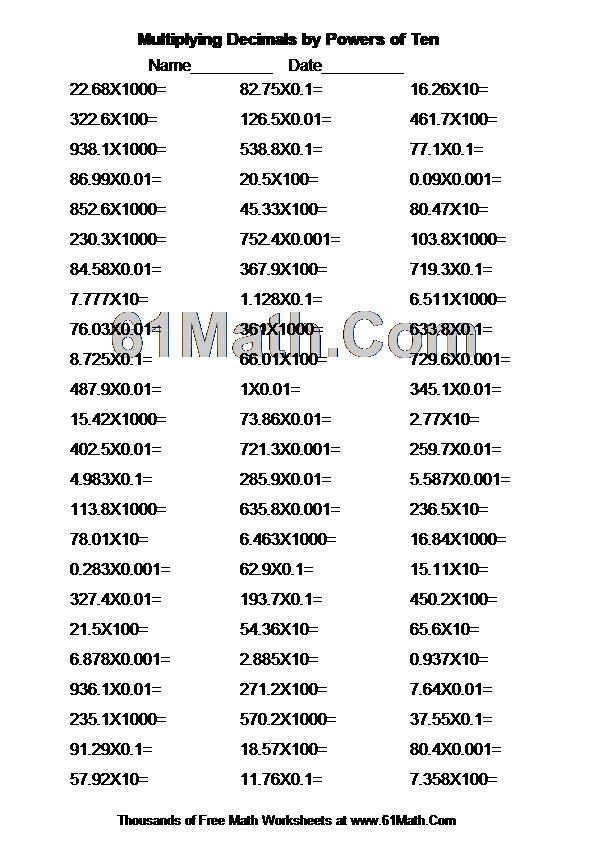 小数点的移动-乘以0.1、10 Worksheet