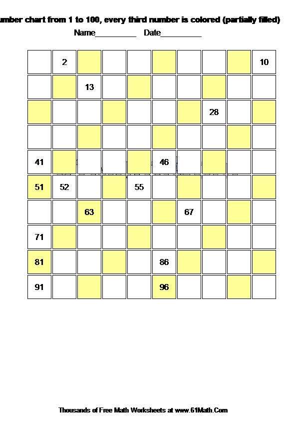 Fill number chart from 1 to 100, every third number is colored (partially filled) Worksheet