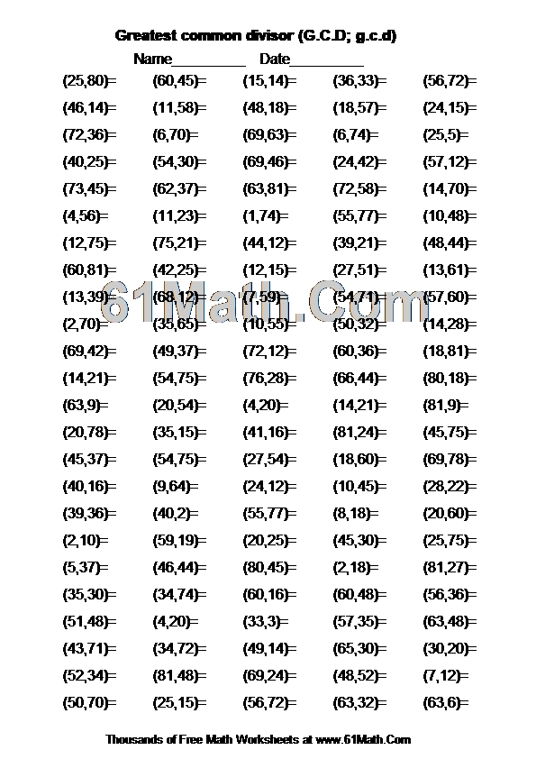 Greatest common divisor (G.C.D; g.c.d) Worksheet