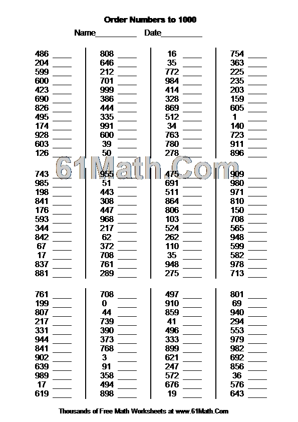 Order Numbers to 1000 Worksheet