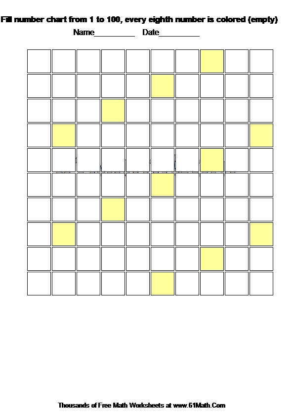 Fill number chart from 1 to 100, every eighth number is colored (empty) Worksheet