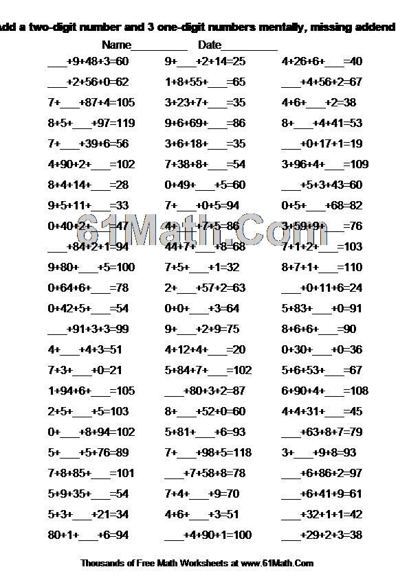 Add a two-digit number and 3 one-digit numbers mentally, missing addend Worksheet