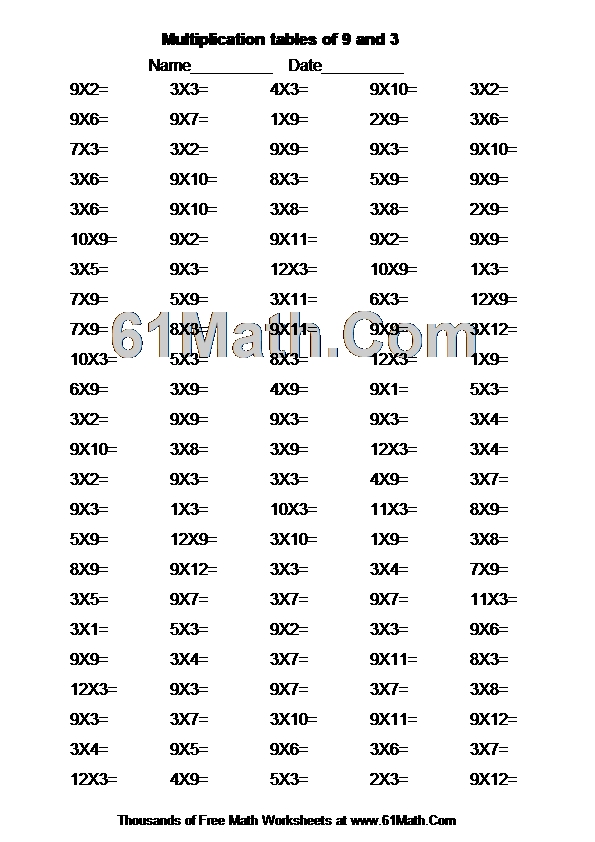 Multiplication tables of 9 and 3 Worksheet