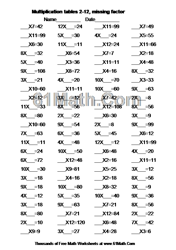 Multiplication tables 2-12, missing factor Worksheet