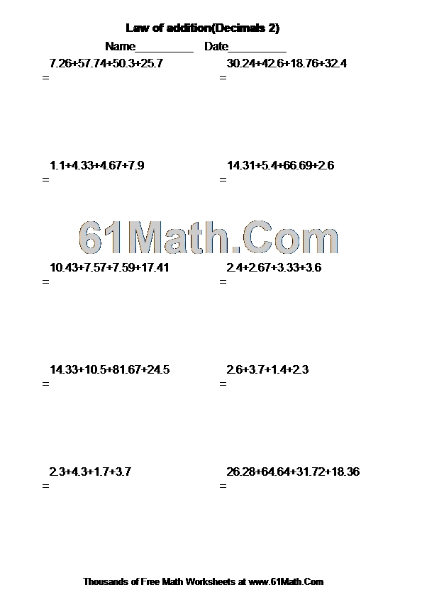 Law of addition(Decimals 2) Worksheet