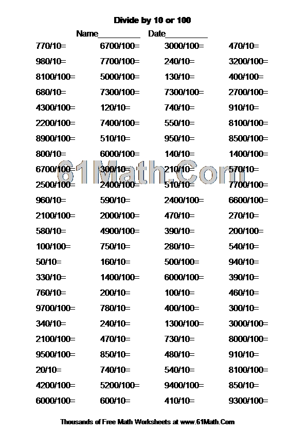 Divide by 10 or 100 Worksheet