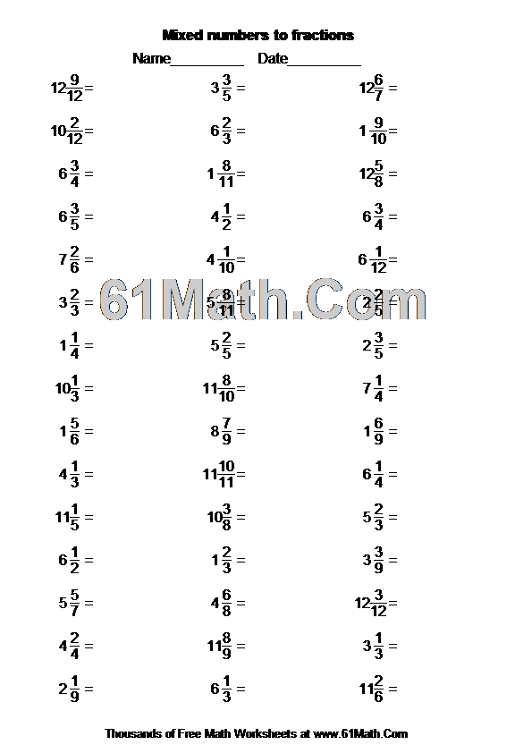 Mixed numbers to fractions Worksheet
