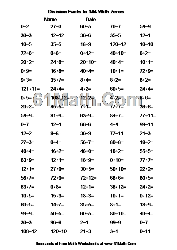 Division Facts to 144 With Zeros Worksheet