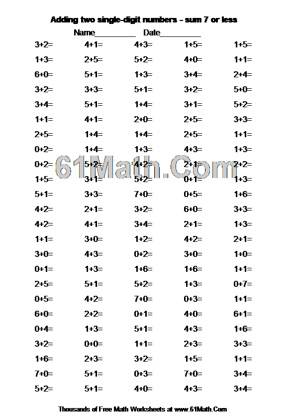 Adding two single-digit numbers - sum 7 or less Worksheet
